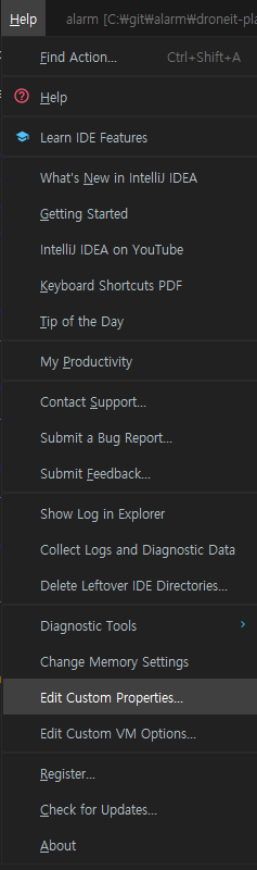 - 몇몇 블로그 및 스택오버플로우에선 Help ⇒ Edit Custom Properties 에서 옵션을 추가해주면 된다고했다.